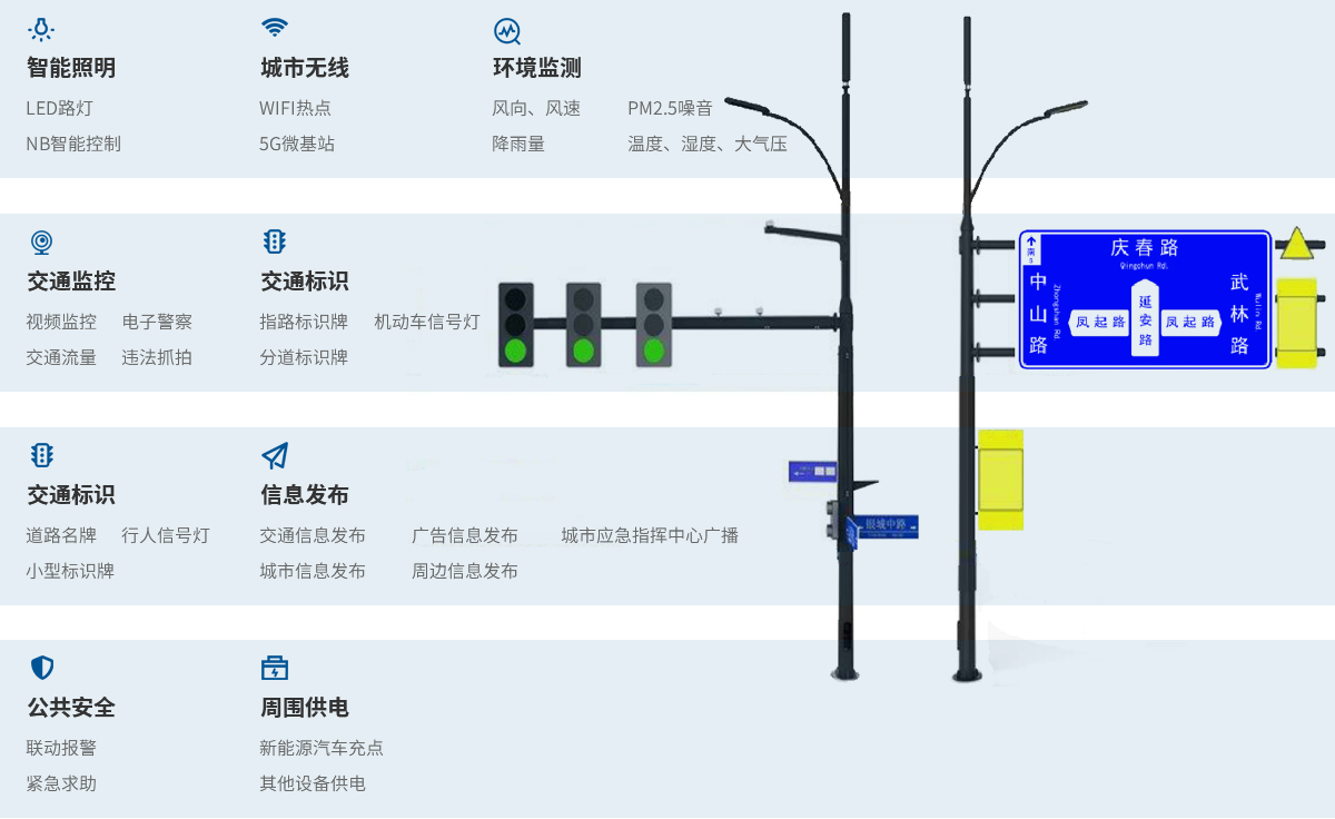 多桿合一、多箱合一、一桿多能,滿足多桿合一功能。 有序使用城市空間,美化道路環(huán)境,提升城市形象。 高度重視資源集約利用,降低市政支出,節(jié)約城市建設(shè)成本,促進城市綠色發(fā)展。